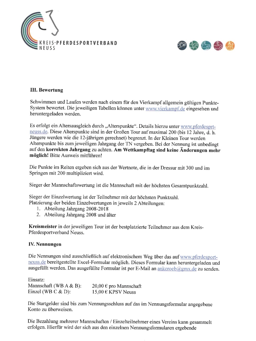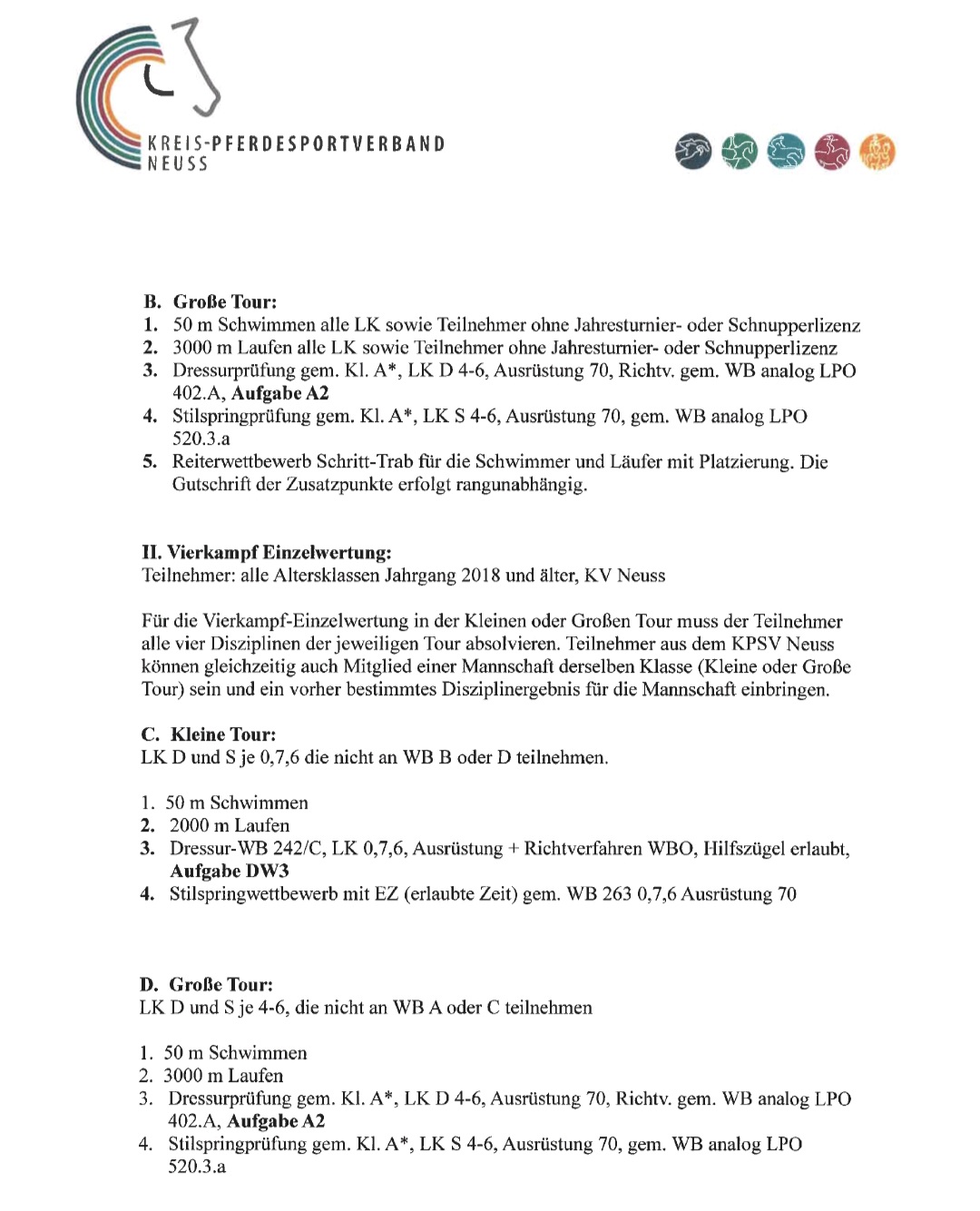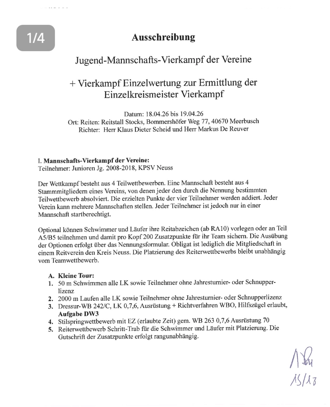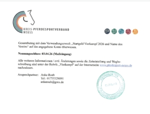 Jugend-Mannschafts-Vierkampf der VereineJugend, Turnierinfos, Verband, Vereine, Vierkampf (FOTO: PRIVAT) Hier findet ihr die genehmigte Ausschreibung mit allen Informationen zum diesjährigen Vierkampf, der am 18.04. und 19.04.2026, auf der Reitanlage der Familie Stocks, in Meerbusch Osterath, stattfindet. 22. Januar 2026/von Anja Mede https://www.pferdesport-neuss.de/wp-content/uploads/2024/02/psn_banner.jpg 0 0 Anja Mede https://www.pferdesport-neuss.de/wp-content/uploads/2024/02/psn_banner.jpg Anja Mede2026-01-22 10:41:222026-01-22 10:43:07Jugend-Mannschafts-Vierkampf der Vereine